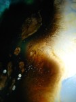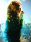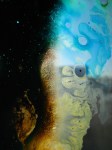 I bought a box of overhead projector transparencies, a new tube of acrylic ink, and an Xacto knife, and came home to make more interesting messes. By now, I’ve got a decent idea of how the different paints and inks behave independently and in tandem with each other and other additives. But I didn’t expect that, given the larger surface, the paints and inks would just continue to expand across the surface area. With the smaller 35mm filmstrips, the pigments were contained, concentrated. Here, they just keep on going.