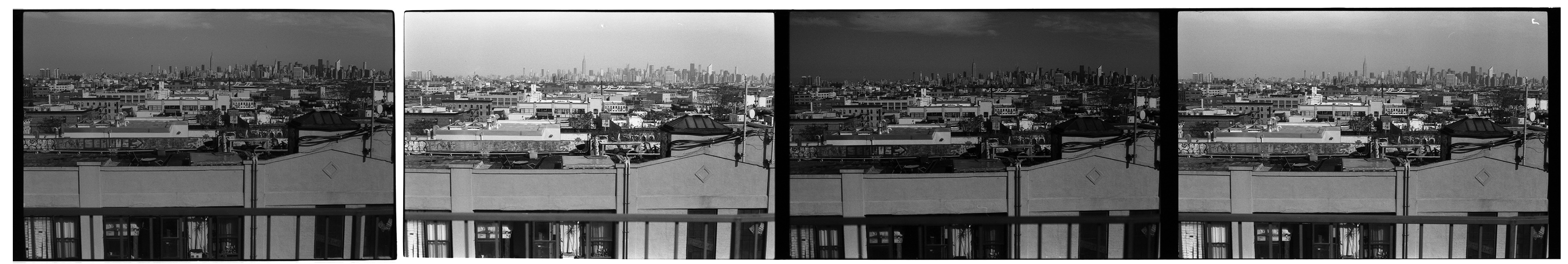 Testing filters. Left to right: yellow, blue, red (28), UV clear. The view from the roof in Fomapan 100. Canon AE-1, 50/1.8 lens. Click for larger view.